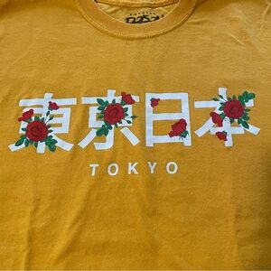 Features- beautiful graphic t-shirt by Poison / “Tokyo” with Japanese lettering and red roses on bright yellow soft & comfortable