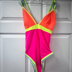 Popvil - One Piece Swimsuit Women Neon Color Block Bathing Suit