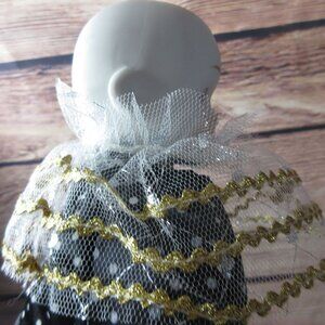 This charming 13-inch vintage porcelain clown doll is adorned in blue and white polka dots. A delightful collectible from the 1990s, perfect for doll enthusiasts or as a unique decorative piece.