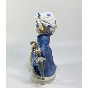 This beautiful high gloss finish of a young girl with an umbrella and flower basket and a polka dot kerchief. The porcelain material and hand-painted features make it a unique and valuable addition to any collection. The glazed finish and contemporary style enhance its beauty, making it suitable for any room. The figurine is from the KPM brand and was manufactured in Japan in 1990. It measures 7.5 Tall X 4.5 Wide.