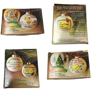 Design an Ornament Set is in good vintage condition. Two Fine Porcelain Collectible ball ornaments are included. No markers or cardboard stands are included. Decorate with any paint markers or paints. Instruction and ideas booklet is included. Box shows wear from storage and age. Some sticker residue. Porcelain ornaments have some marks on them. The tops are tarnished. Each ornament is approximately 2.5” x 3”. Please see photos for details.