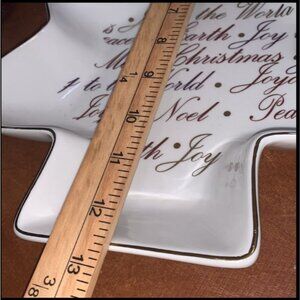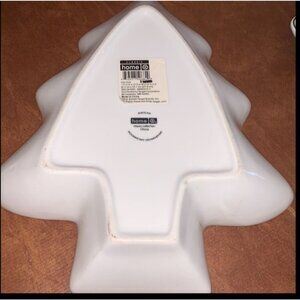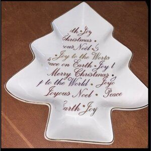 This porcelain dish from the Homeo Classic Collection adds a festive touch to your holiday table. It's designed in a charming Christmas tree shape with elegant script that celebrates the spirit of the season. Ideal for serving treats or as a decorative piece, it complements any holiday setting. • Christmas tree-shaped design • Porcelain material • Microwave and dishwasher safe • Elegant script pattern • Measures approximately 12 inches across Length at widest point = 12 inches