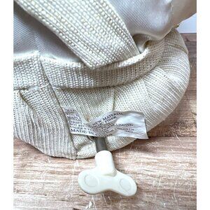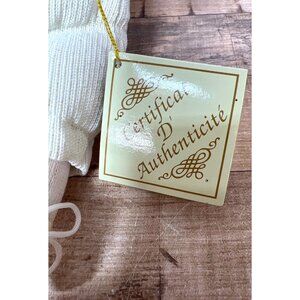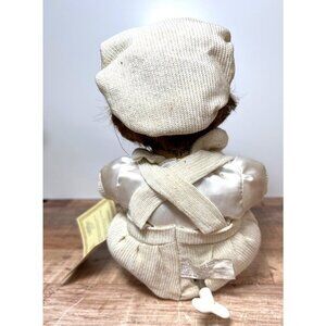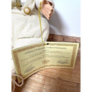 This collector's doll features a porcelain face and hands, dressed in a cream outfit with gold accents. Includes a certificate of authenticity. Winds up, Plays music and moves