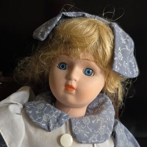 This porcelain doll is in excellent condition. The white over her dress has some slight discoloration from sitting on a shelf for so long, otherwise awesome condition! I don't have the original box, so it will be wrapped securely, and shipped is a generic shipping box.