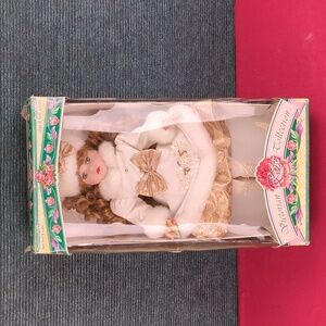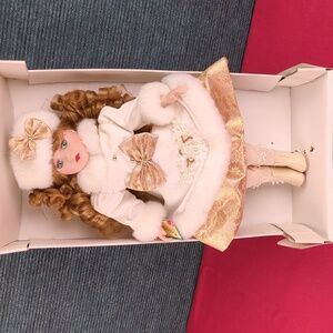 Beautiful winter porcelain doll! Dressed in winter white and gold foil with white faux fur trim, and a white fur cossack hat.