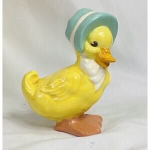 Adorable duckling in blue bonnet with a white bow. No chips or cracks. No markings. Stands approx 3.75” tall.