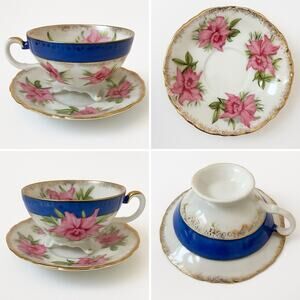 Porcelain Footed Tea Cup & Saucer Pink Orchid Flowers Cobalt Blue Gold