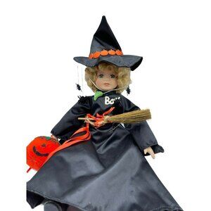 Porcelain Halloween Witch Boo Doll W/Broom Jackolantern Pumpkin Black Spider Hat