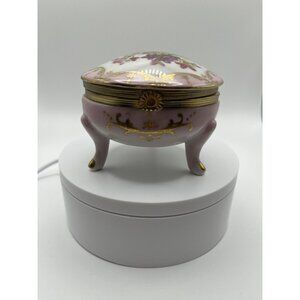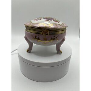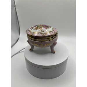 Porcelain Hand Painted Trinket Box Hinged Lid 4 Pedestal Legs Pink Floral VTG