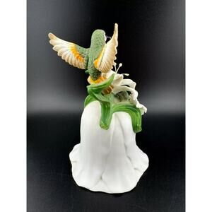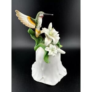 Darling little hummingbird with lilies bell. The bell looks like petals. Greens, yellows and whites.