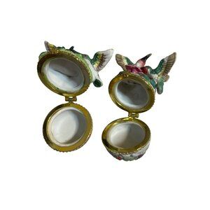 Porcelain Hummingbird Trinket Boxes With Floral Accents & Gold Trim - Set Of 2