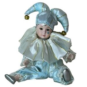 Charming porcelain jester doll. Features a blue and gold outfit with delicate details. Perfect for collectors and clown enthusiasts