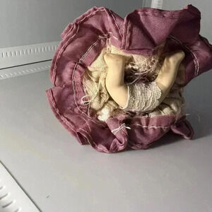 Porcelain Mini Doll Straw Hat And Pink Dress Collectible