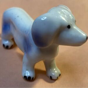 Add a charming touch to your home decor with this exquisite vintage mini porcelain Dachshund figurine. The glossy white finish with blue accents brings this adorable puppy to life, making it a perfect addition to any animal-themed collection. This small-sized figurine is a great conversation starter and is sure to bring a smile to anyone's face.