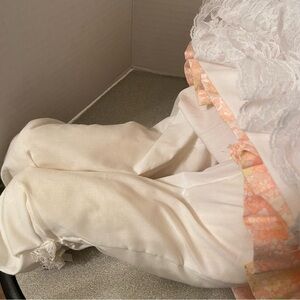 Porcelain Petticoat Realistic Face Hands Blonde & Blue Eyes Fair Skin Baby Doll. Vintage Porcelain Face & Hands Blonde And Blue Eyes Petticoat Baby Doll. The porcelain face has light rosy cheeks, matching lip color, blonde realistic eyelashes, natural blue eye color and blonde eyebrows. Porcelain hands has pinkish nails as the color. No hair on the head, outfit is a head bonnet, traditional long sleeve peach print dress, white petticoat outer dress with matching pull on leggings. Material is cotton. Face is realistic like a rebirth doll. Body and legs are sufficiently stuffed with beads that can be felt by touch. Body length is 21’ inches and from arm to arm 12’ inches. Little discoloration on one of the hands as pictured but overall In good condition.