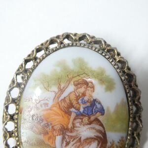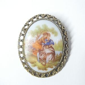 Vintage pin with a brass frame and porcelain inset of a couple. Signed