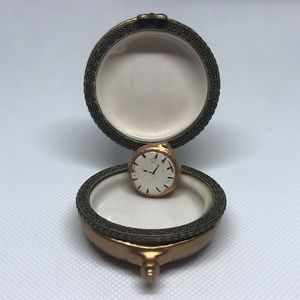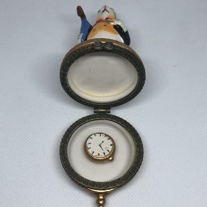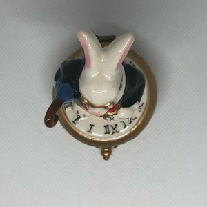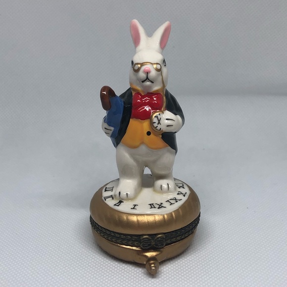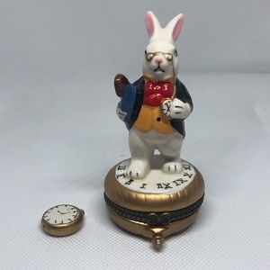 Alice in Wonderland themed figurine box that opens to reveal a pocket watch. Perfect condition. Just in time for Easter rabbit themed decorations.