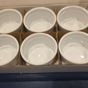 12 Elegant white porcelain ramekins perfect for baking and serving. Dishwasher, microwave, and oven safe.
