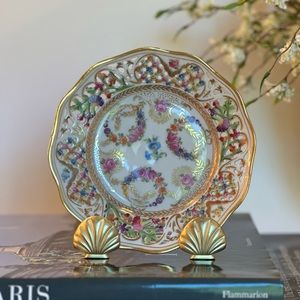 Schumann Bavaria porcelain reticulated plate w/multicolored floral pattern and gold rim. BEAUTIFUL vintage condition collector decorative plate.