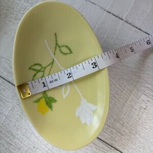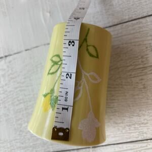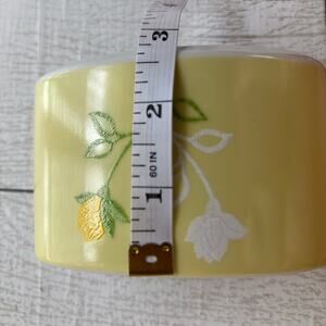 Porcelain rose 3 piece bathroom accessory set; toothbrush holder, soap holder and tumbler. Each piece has a yellow and white rose image.