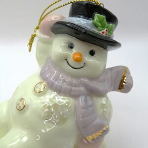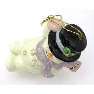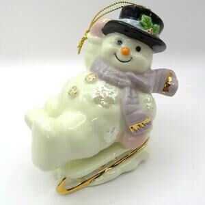 This charming porcelain snowman ornament measures approximately 4.5" tall and features a smiling snowman in a black top hat, lavender scarf, and pink mittens, on a sled with gold-painted accents. The glossy glaze highlights the cheerful expression and fine details, making it a perfect collectible or seasonal decoration.