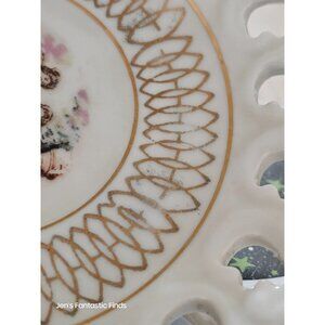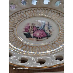 This beautifully crafted porcelain plate features a charming Victorian couple design and intricate gold trim. Ideal for collectors and vintage decor enthusiasts.
