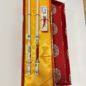 The box includes one pair of beautiful white porcelain chopstick with red plum pictures and one porcelain rest. They can be used as real chopsticks or one of your hobby collections.