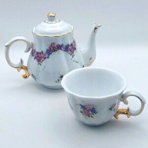Porcelain Tea For One Floral Stackable 3 Piece Tea Set Roses Gold Trim