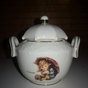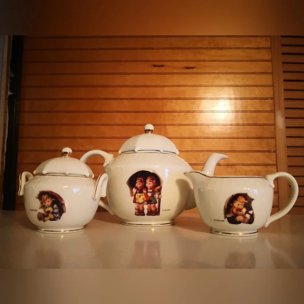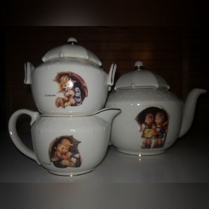 Beautiful porcelain 3 piece tea set in perfect condition. Images on both front and back of each item. Gold trim detail. Set had been displayed as decor.