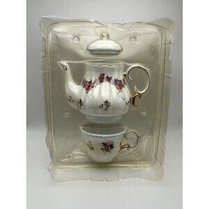 1 Boxed porcelain Tea-for-One set with rose garland decals and gold-tone gilt trim, includes stackable teapot and matching cup seated in the original plastic tray. Made in China (item #249044), likely late-20th/early-21st century. Porcelain body with gilt accents, ideal for gift, display, or single-serve tea rituals. Stored in a smoke-free home. Ready to ship! Always down to bundle items together. Feel free to reach out with any questions or offers!
