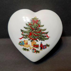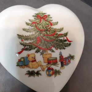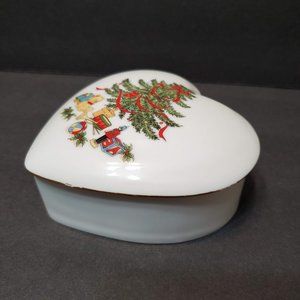 This is a vintage Heart-shaped Trinket Box / Lidded Candy Dish. It is made of porcelain, and decorated with a Christmas Tree design with gifts and a teddy bear. It has a "made in Japan" sticker on the bottom but no other marks.