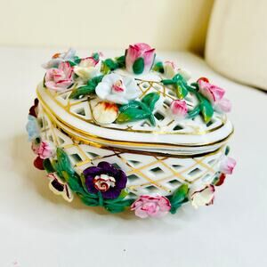 Porcelain Trinket Box Pierced Diamond Lattice Design Colorful Floral Embellishments