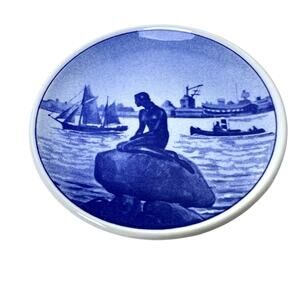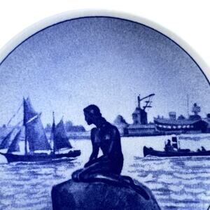 This Royal Copenhagen Denmark Plaquette (mini plate or sometimes called butter pat) features The Little Mermaid statue in blue and white colors.