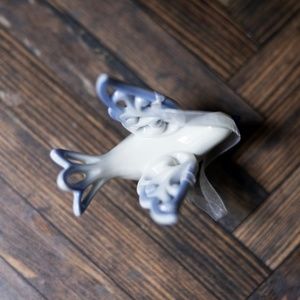 Pretty dove ornament for Christmas, or if you want to use it as a figurine/display piece just cut off the ribbon. Blue and white porcelain with JOY written on one side. Unknown maker and vintage. I don't see any defects. Measures 3.5" tall and 4" across. Smoke- and pet-free home.
