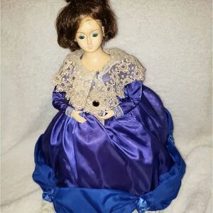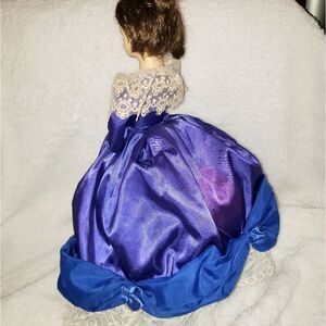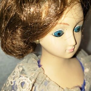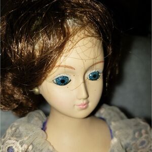 Her gown has discoloration frome the sun and she does have some specs on her face.