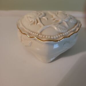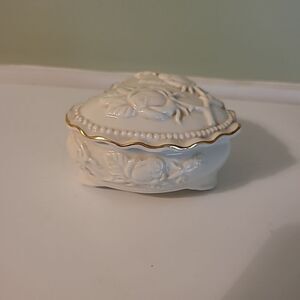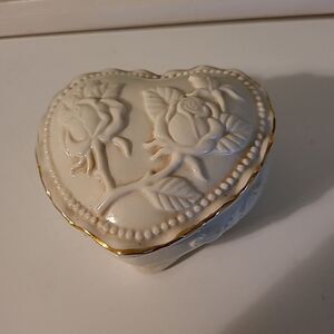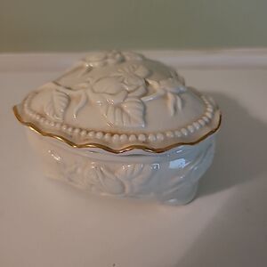Pre-owned in good condition. White porcelain box with a rose pattern. The top has gold trim.