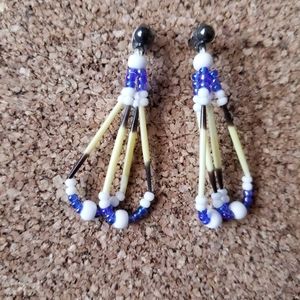 Porcupine quills Native American earrings two loop with blue and white beads about 2 inches.