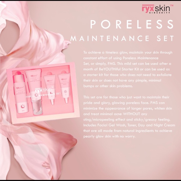 RYX Skincerity Poreless Maintenance Set promises a skin that's glowing more than ever. Furthermore, it is formulated to maintain that new supple skin after rejuvenation process. ... Not these alone, but also, this set helps minimize large skin pores which reflects more toned skin.