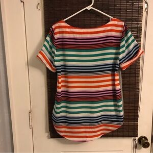 Porridge blouse in great gray color on front and stripes of blue, green,and orange colors on back 50% cotton and 50% polyester in great used condition very comfortable and trendy