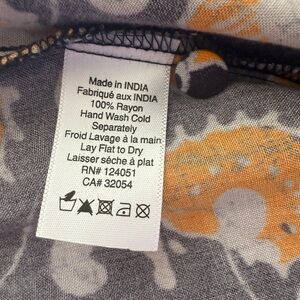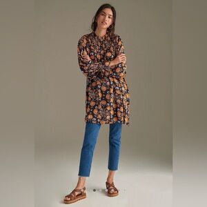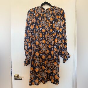 Porridge sold at Anthropologie Darian Tunic dress. Adorable as a dress or over jeans. Navy and orange print. Long sleeves with elastic at the wrist. Mini. Smocked top. Three buttons up the back. Lightweight. 100% rayon.