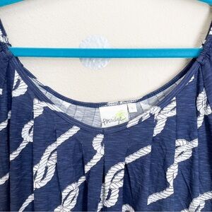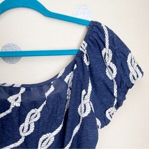 Short-sleeved relaxed-fit nautical knot/rope-themed navy top with puffed sleeves and pleated wide rounded neckline. The tops of the sleeves are elasticized so it can be worn off the shoulder as well. Very good used condition, a little fading around the pleats.