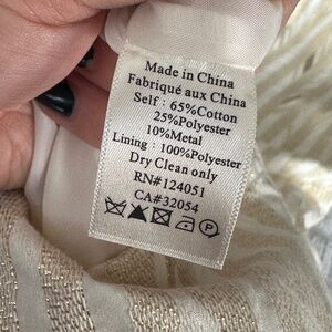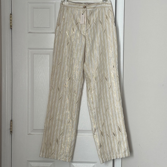 Brand new with tags Porridge pants, size 4. Sold at Anthropologie. Perfect for holidays/new years or for a party, birthday, celebration. Beautiful gold metallic details all throughout. Striped cream and gold pants. Cotton blend, fully lined so they can be worn all year long. High waisted, wide leg trousers.