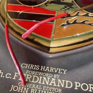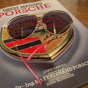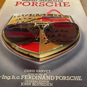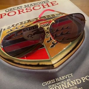 Porsche Design CARRERA, made in Austria sunglasses. Red accents, gold frames, new lenses, Hard back book first edition 1980 sixth impression 1982 ISNN 0 7064 13709 Great Marques Porsche 96 pages book.