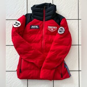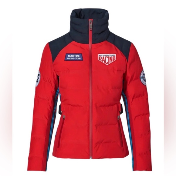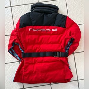 Stylish red Porsche Racing jacket with black accents. Features racing team patches.