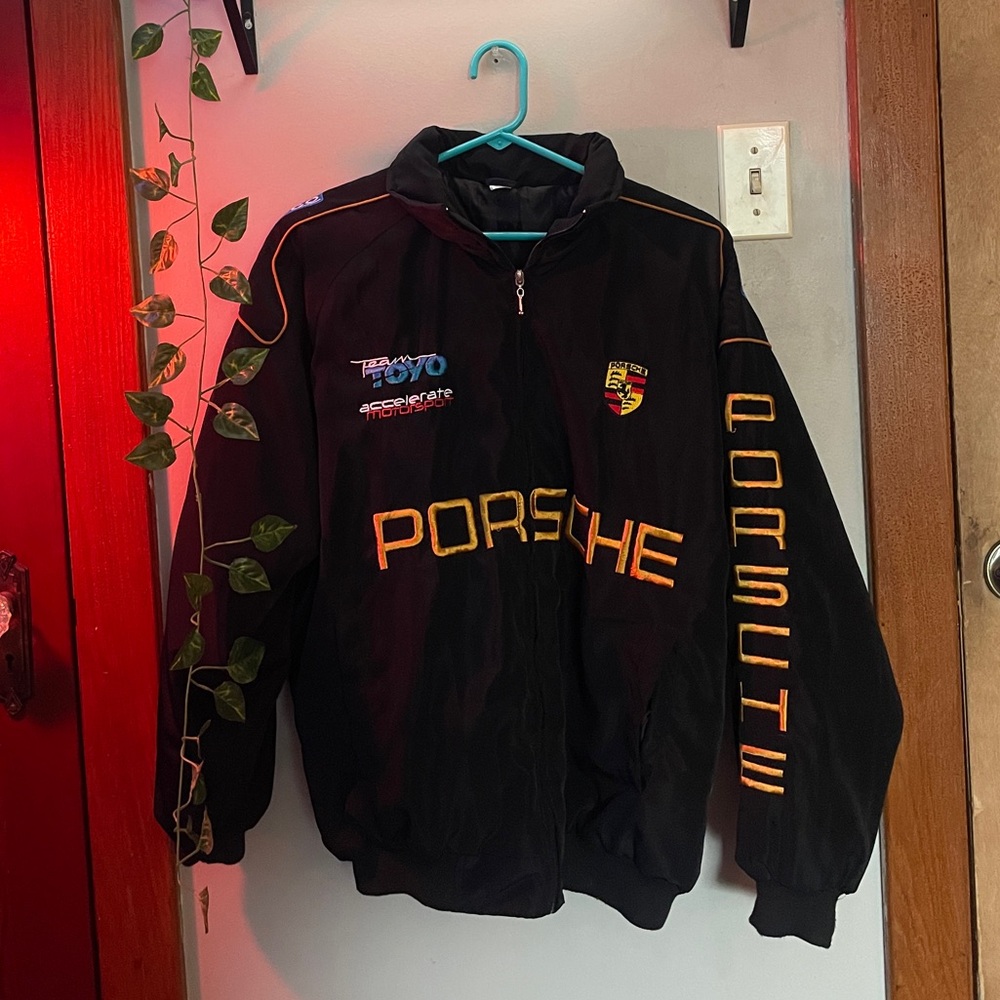 Stylish black racing jacket featuring bold yellow Porsche branding. Perfect for car enthusiasts. Very warm and comfortable
