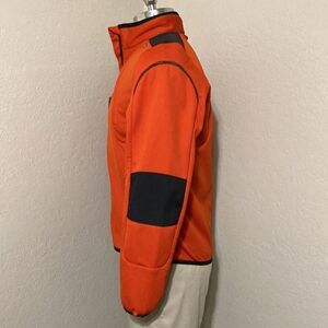 Orange color. Features 2 external side zip pockets and single chest zip pocket. Elastic hem and cuffs with reflective piping at shoulders. 2 interior open side pockets. External shell is polyester with stretch. Interior is lightweight fleece.