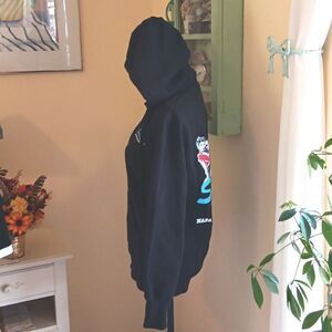 This says "Napa Valley California " but everyone knows Susie's is in Calistoga ( in the Napa Valley) but, come ON! Susie's is an iconic watering hole, HISTORIC, not to be lumped in with all the fluffy wine bars and tasting rooms. Zip up front with a hood. Pouch pockets. Size M measures 38 at chest, 34-40 at ribbed hem. 26 long from shoulder to hem. Get REAL at Susie's in CALISTOGA, Ca.!