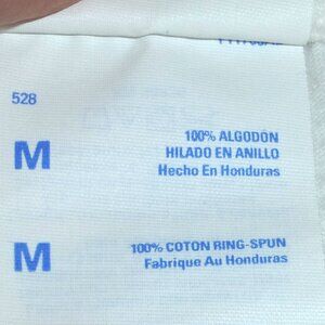 T-SHIRT WAS WASHED, BUT STILL HAS STAINS ON THE SLEEVES ON BOTH SIDES, AROUND NECKLINE, ON THE FRONT AND BACK OF THE T-SHIRT AT SOME SPOTS, NO TEARS OR HOLES