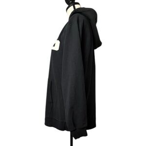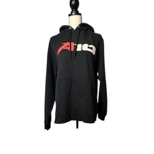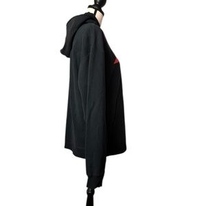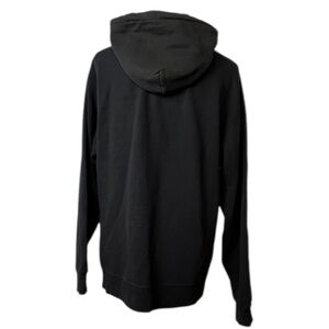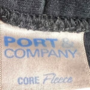 Classic black hoodie by Port & Company, featuring a bold red and white front logo print and a soft brushed interior for warmth. Made from cozy mid-weight fleece fabric with a kangaroo pocket and adjustable hood drawstrings. Suitable for both men and women. Made in Honduras. Ideal for casual wear, lounging, or layering in cooler weather. Clean, gently used condition with minimal wash wear and no visible stains or damage.