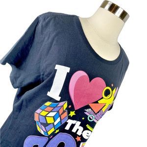 Black tee with colorful “I love the 80s” design on front